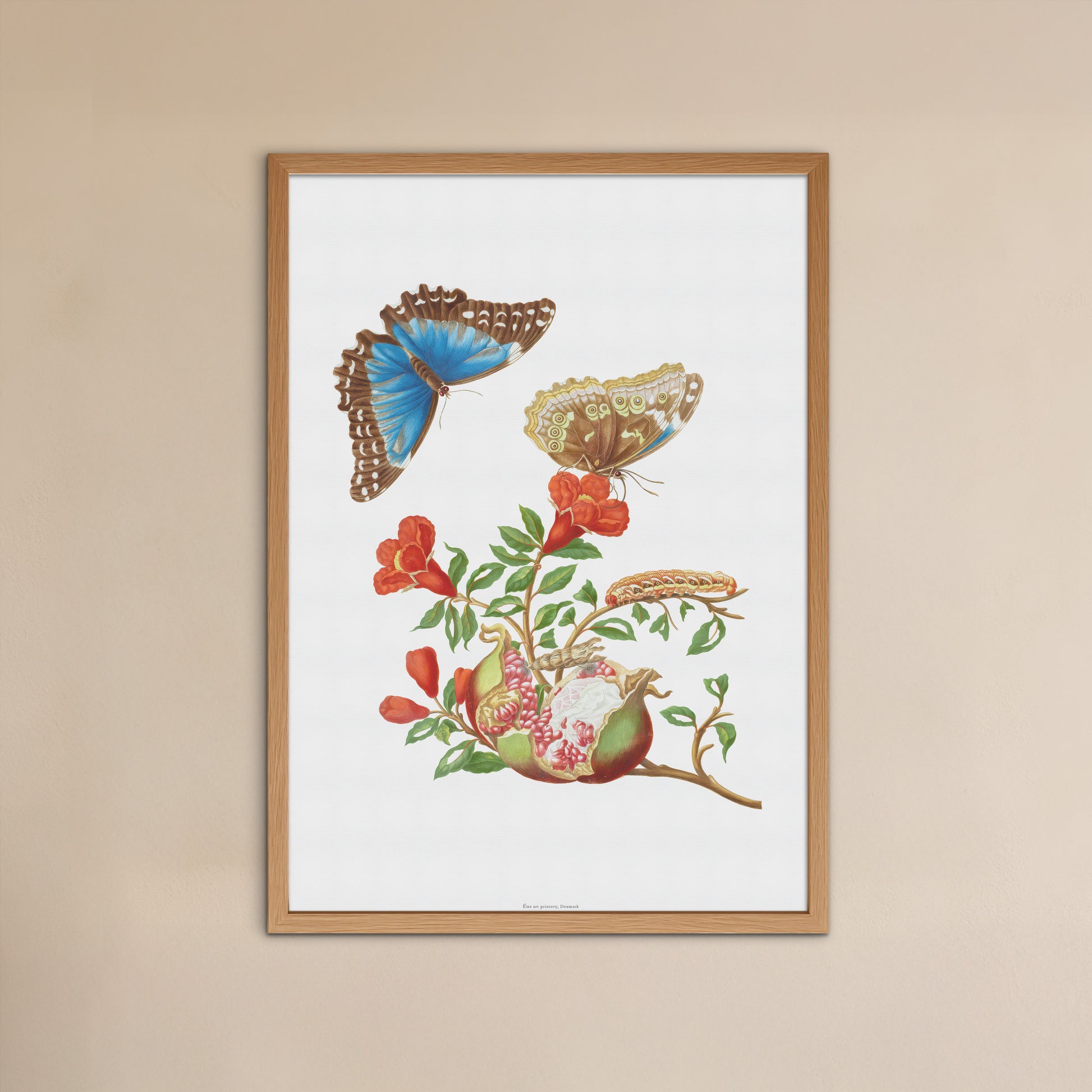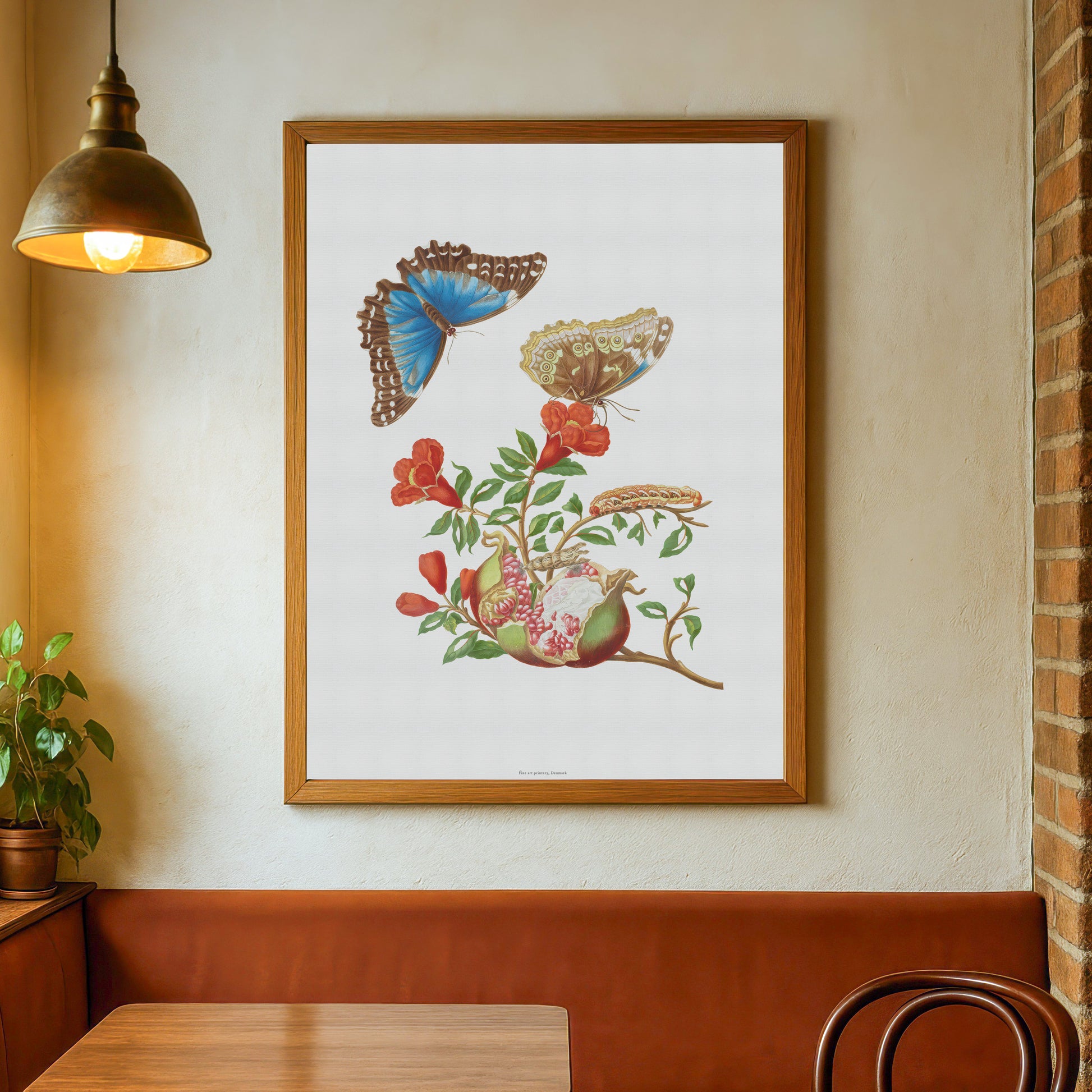 Plakaten viser et granatæbletræ, hvis frugt er brudt op for at vise de saftige kerner. Omkring planten ses en larve, en kokon og den majestætiske Menelaus Blue Morpho sommerfugl (Morpho menelaus). Merian var pioner i sin tid ved at illustrere insekter i deres naturlige miljø og skildre hele deres livscyklus, hvilket tilføjer en unik og videnskabelig dybde til værket.