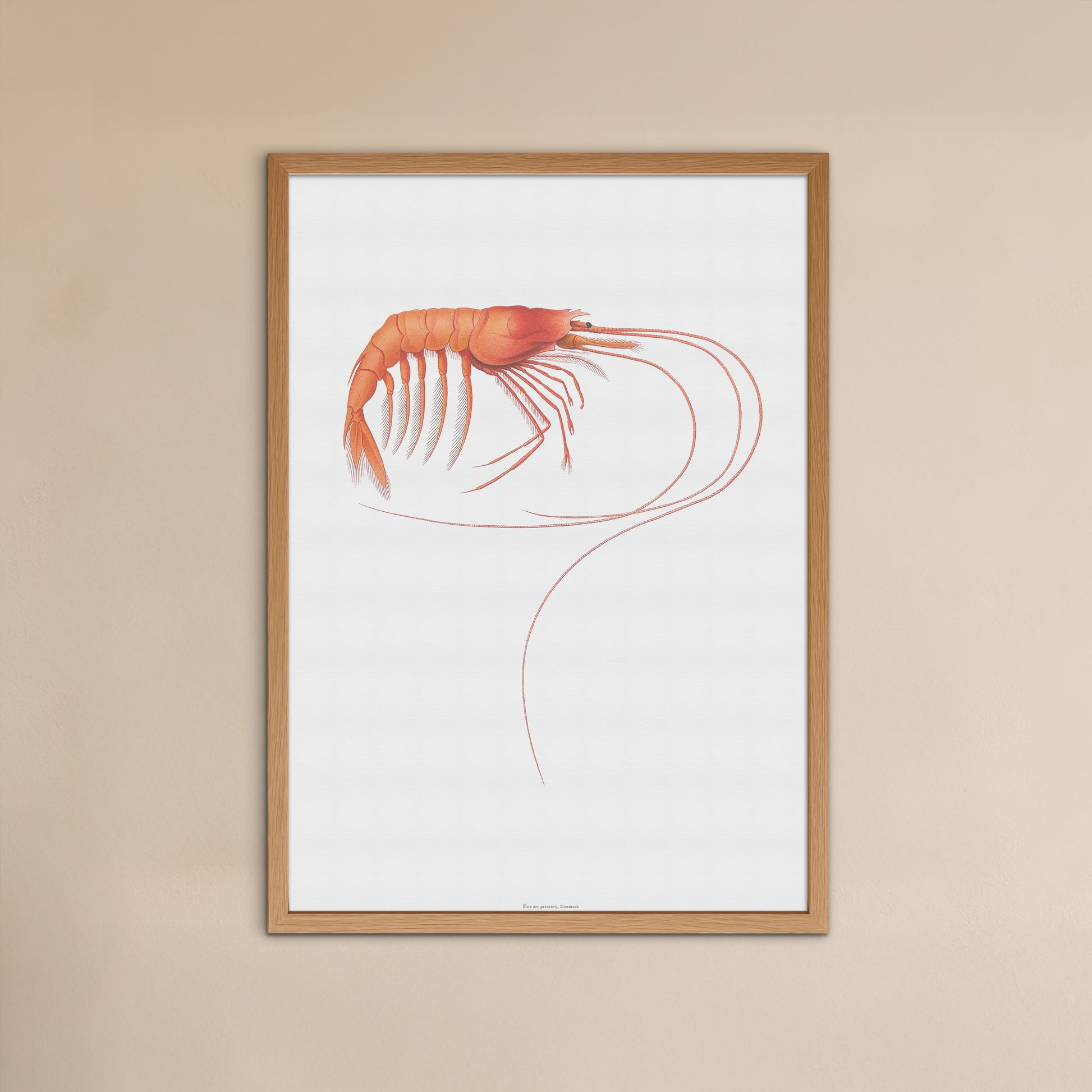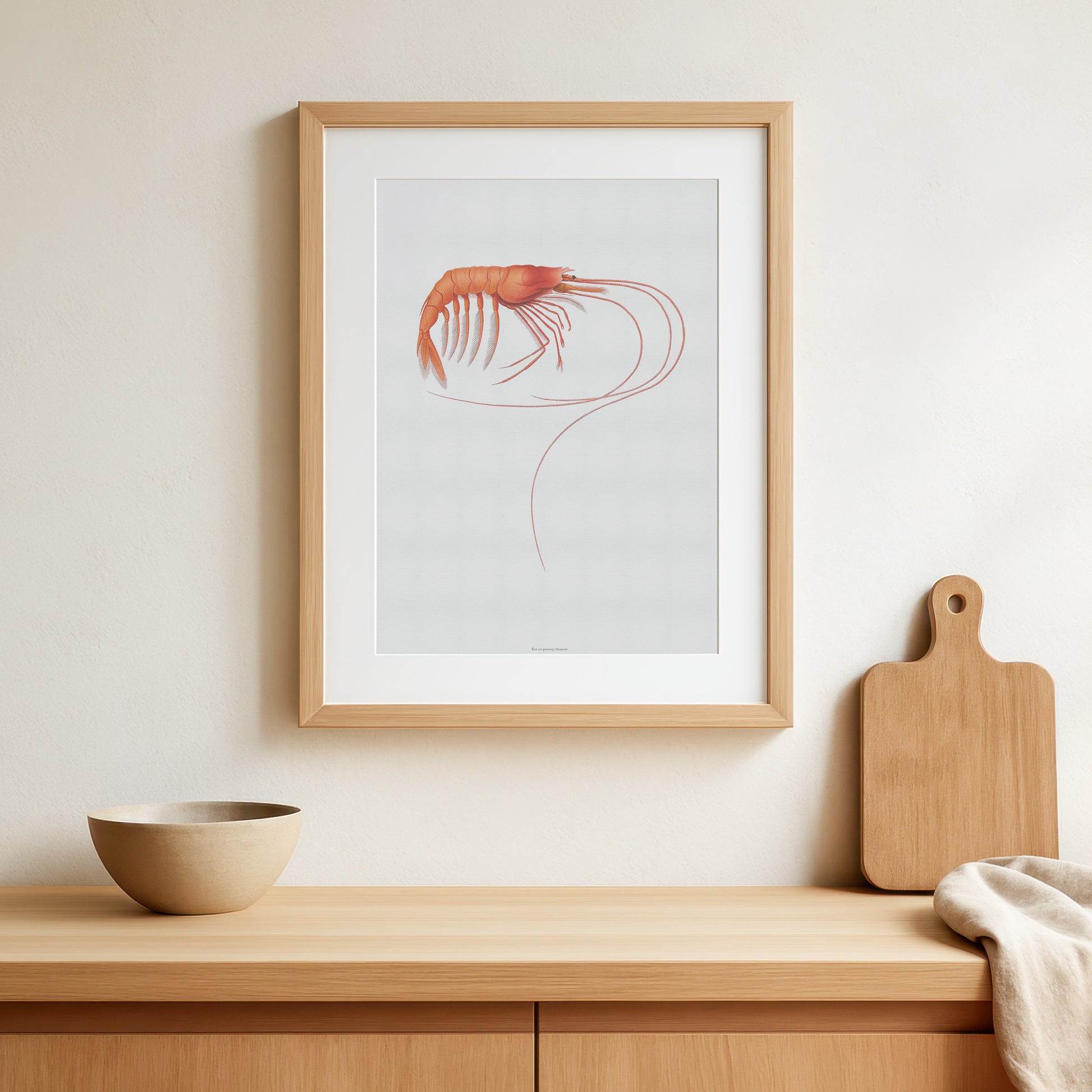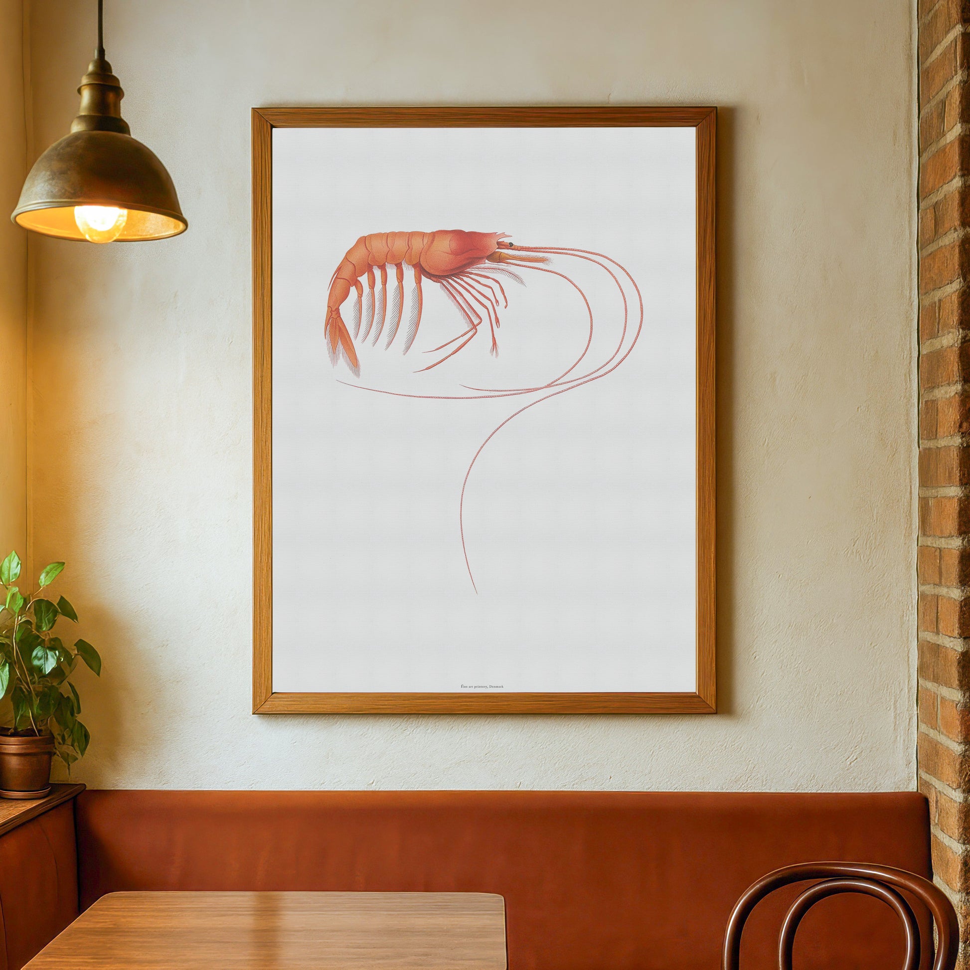 Plakaten viser en yndefuld illustration af en reje, detaljeret med præcise linjer og smukke farver. Dens lange, slanke følehorn og krumme krop giver et dynamisk og minimalistisk udtryk, der passer perfekt til en moderne, maritim eller skandinavisk indretning. Den hvide baggrund fremhæver illustrationens fine detaljer og skaber et roligt og stilfuldt visuelt fokus.
