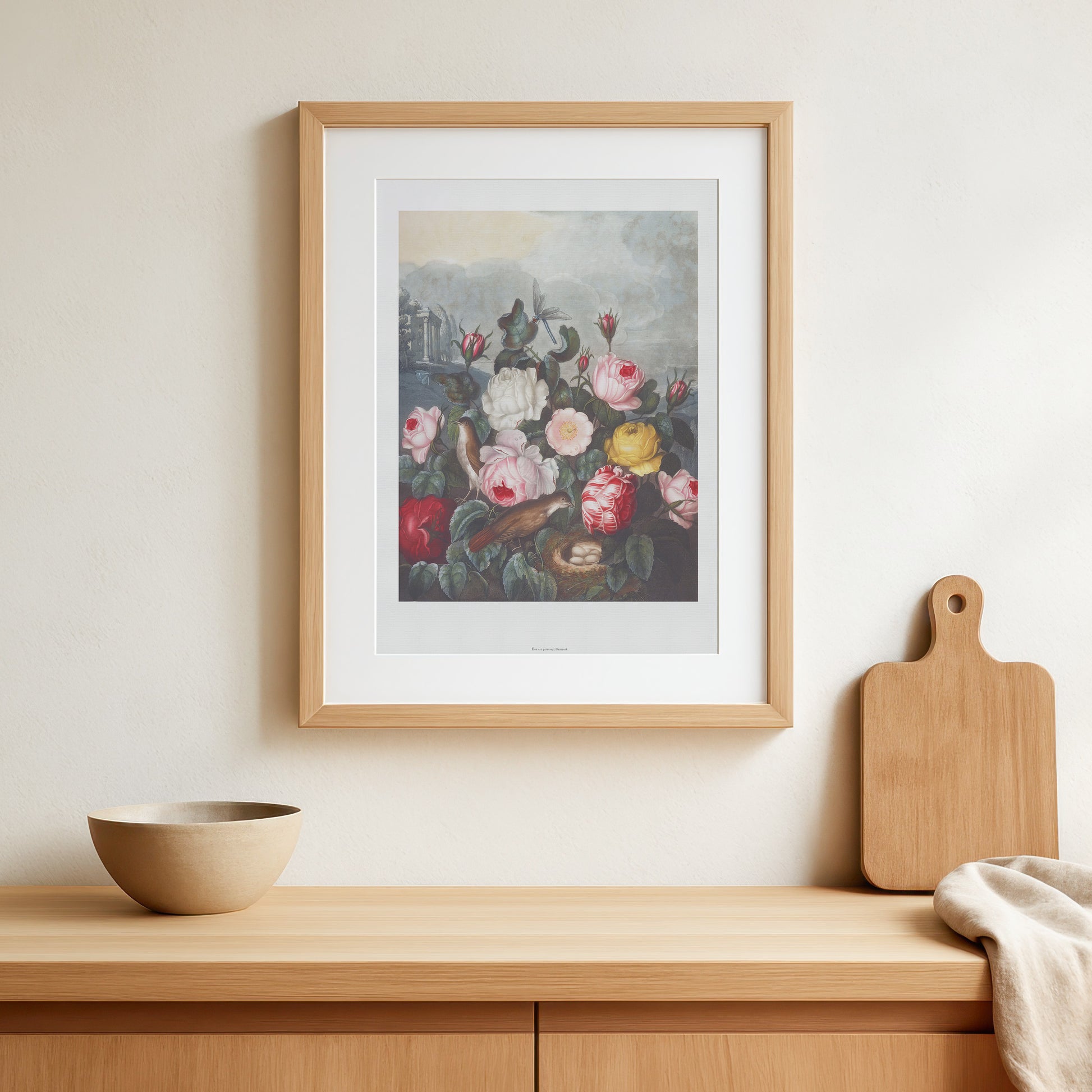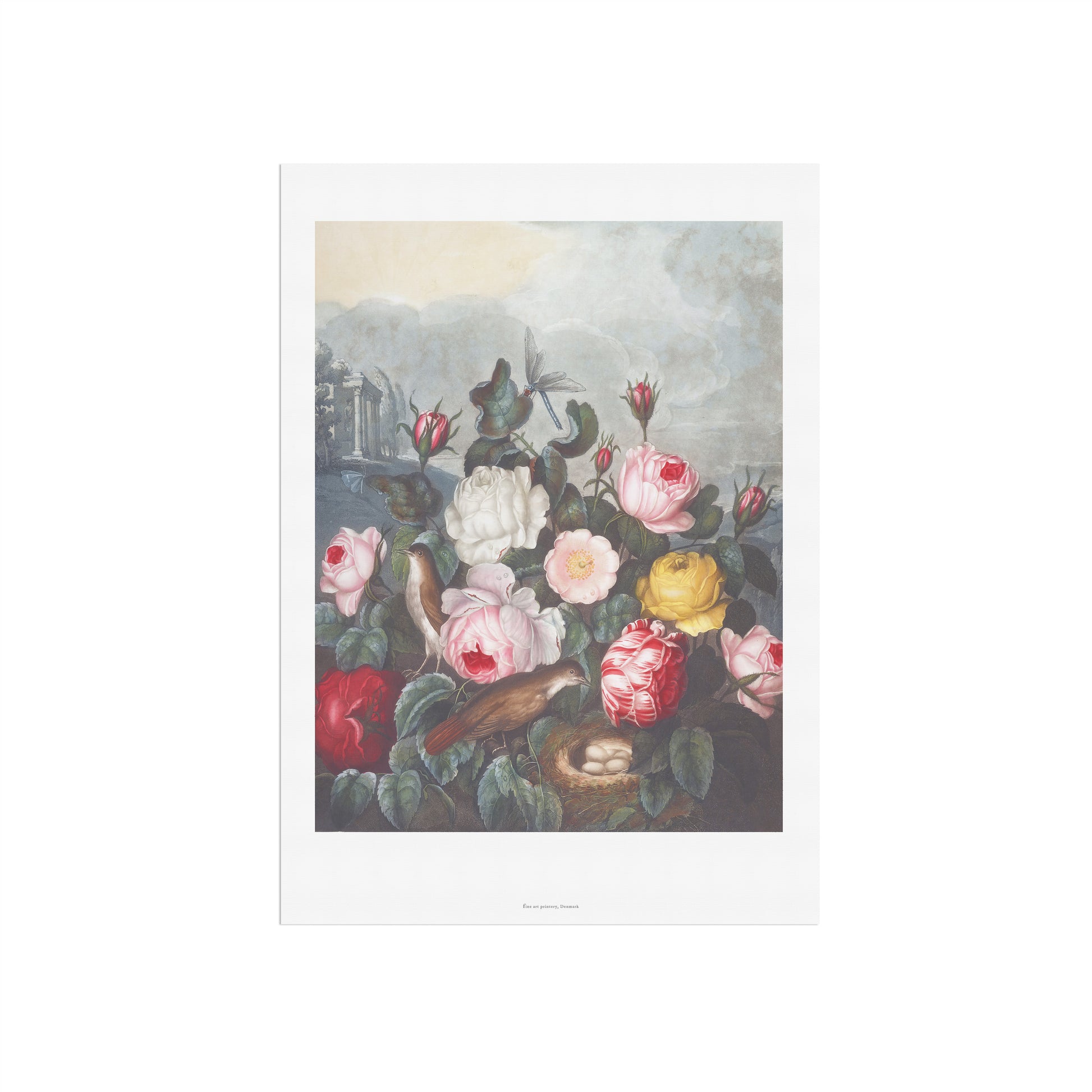 Vintage Rose Plakat - Roser og Fugle fra The Temple of Flora (1837) | Robert John Thornton