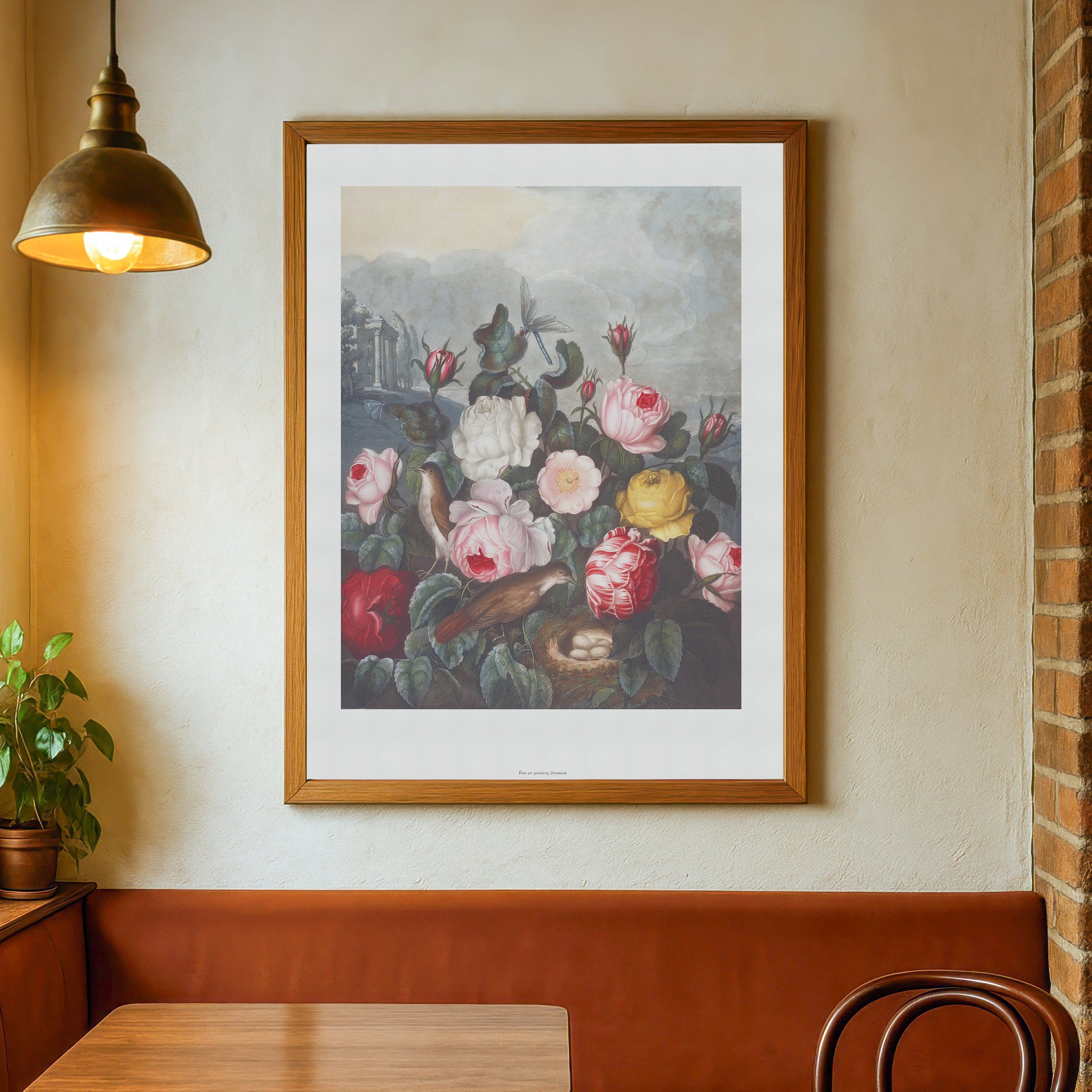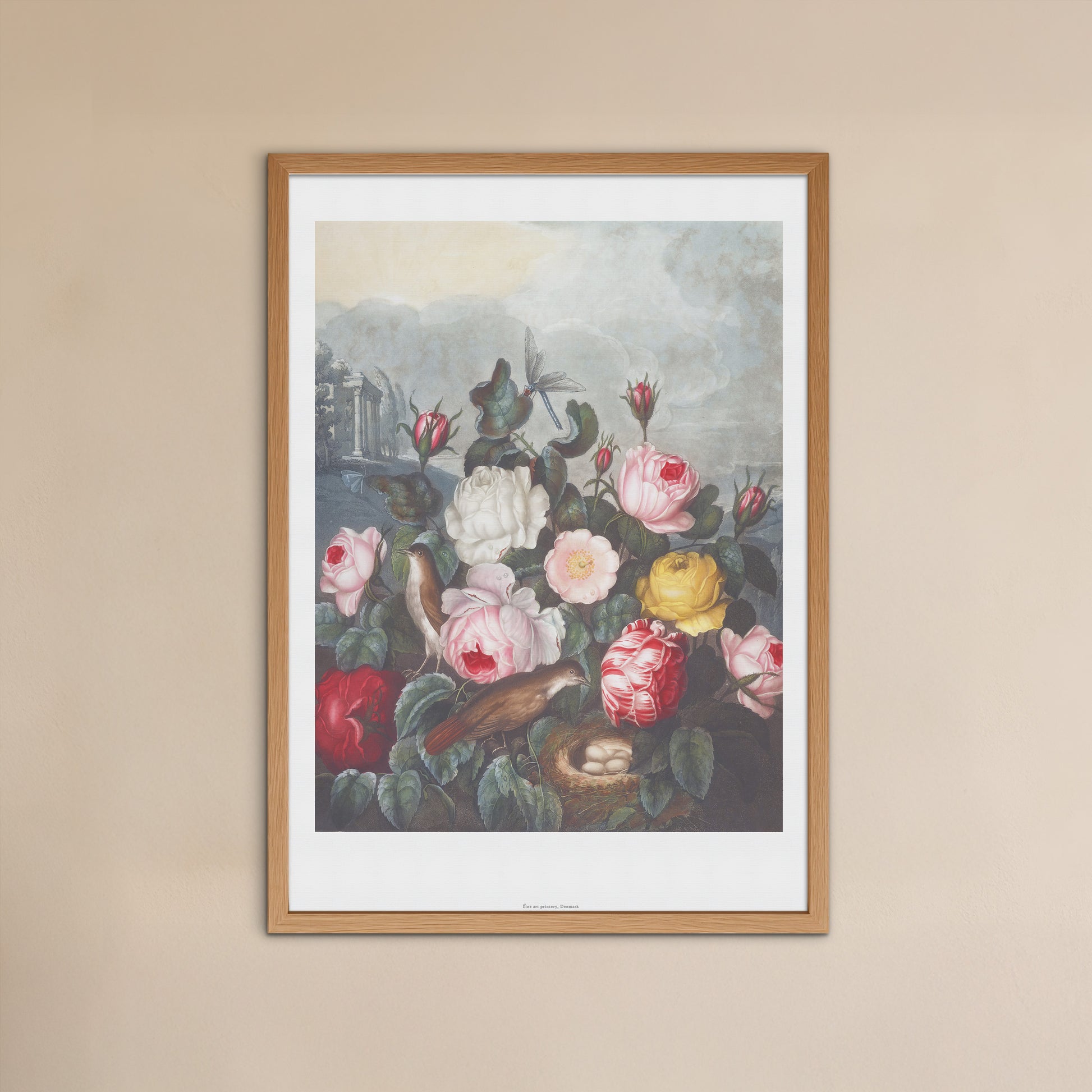Plakaten fremviser en storslået buket af roser i forskellige farver – fra hvide og lyserøde til dybe røde og gule nuancer. Illustrationen er mere end blot en botanisk gengivelse; den fortæller en historie med sine fine detaljer. Nederst i motivet ses en lille fugl, der sidder ved sin rede med æg, hvilket tilføjer et element af liv og naturmystik. En guldsmed svæver desuden elegant over roserne.