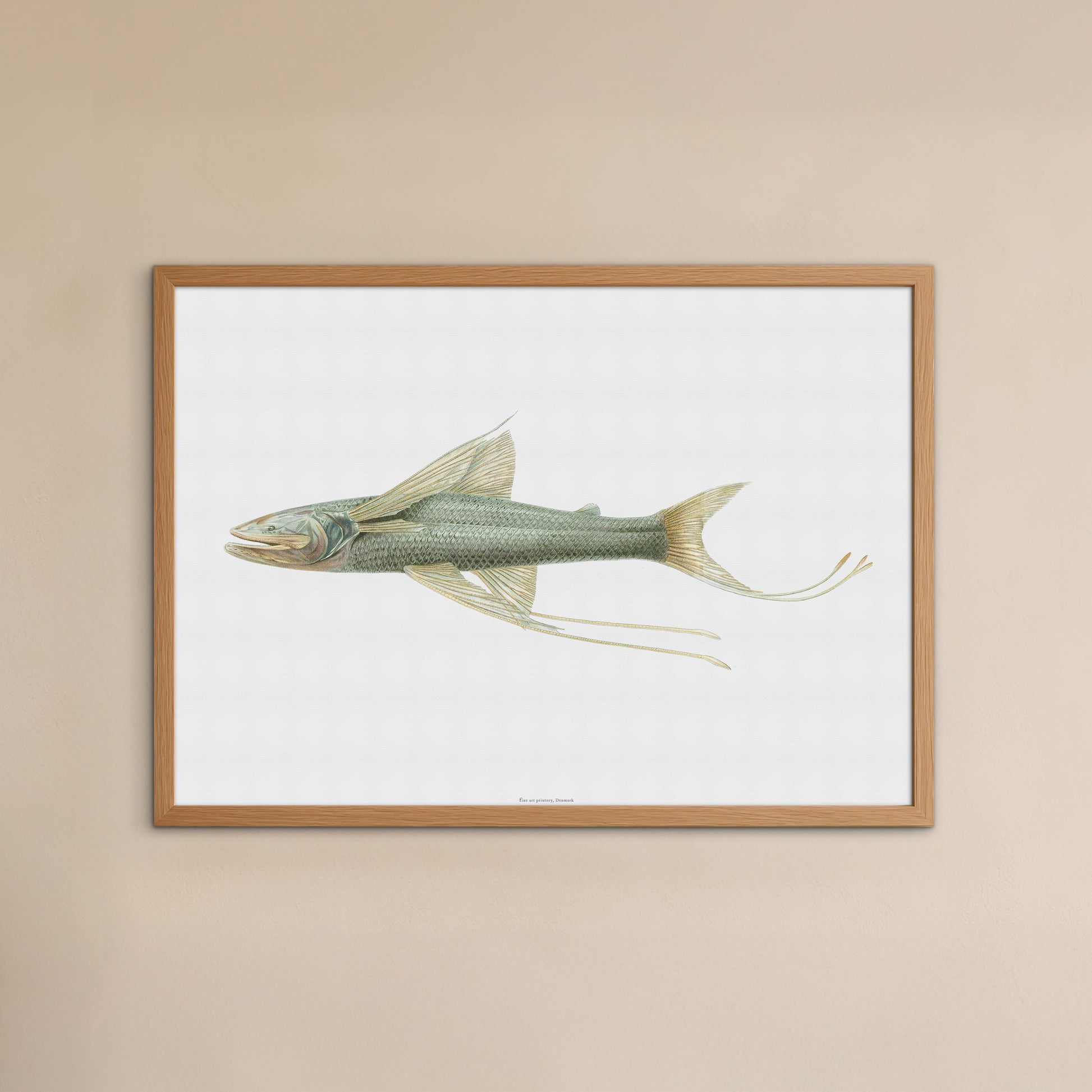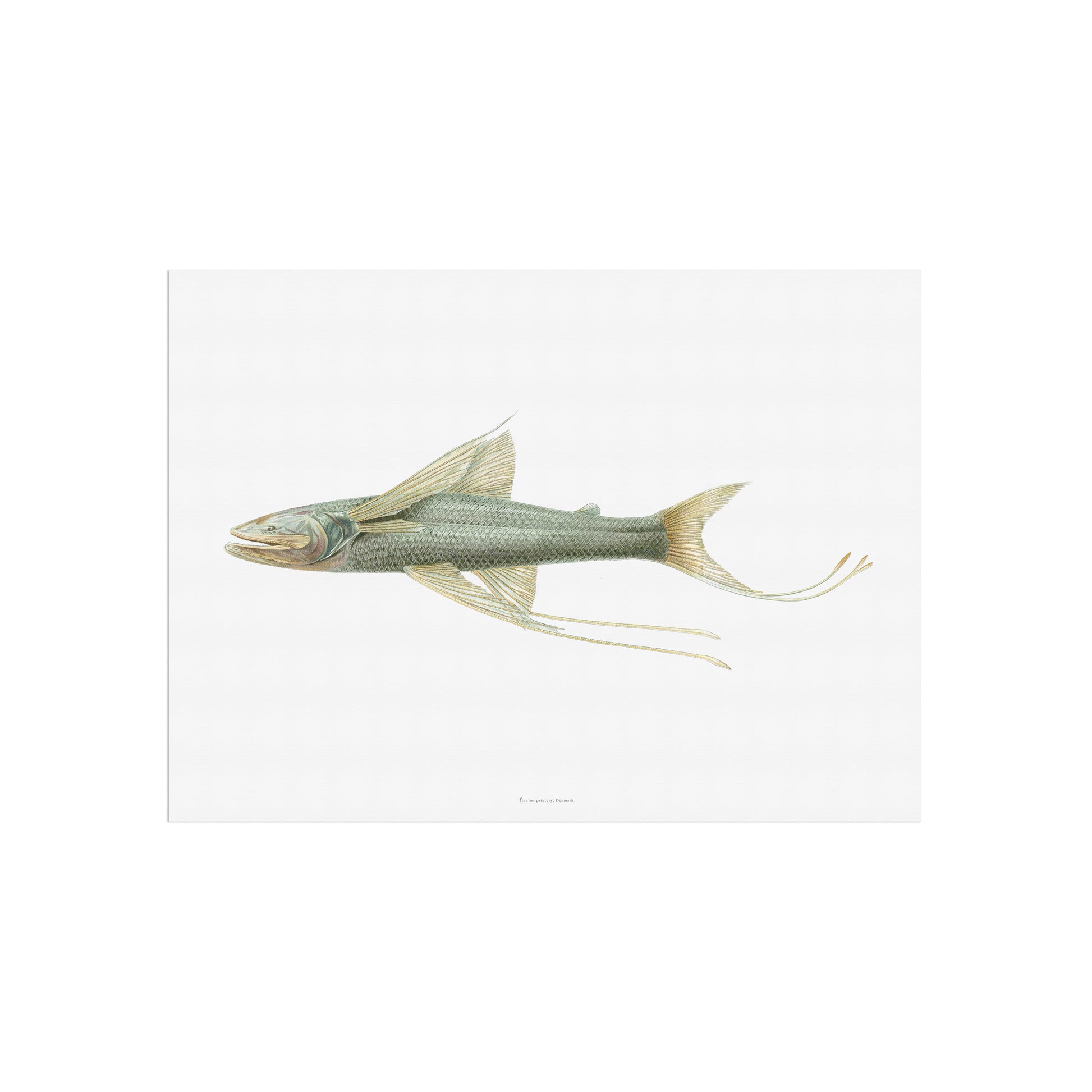 Giv din indretning et strejf af havets dybeste mysterier med denne fascinerende vintage plakat, der viser den utrolige "Trefodsfisk" (Bathypterois viridensis). Motivet er en autentisk reproduktion af en illustration fra den videnskabelige publikation "Résultats des Campagnes Scientifiques" fra 1919, som dokumenterer fundene fra Prins Albert I af Monacos banebrydende oceanografiske ekspeditioner.