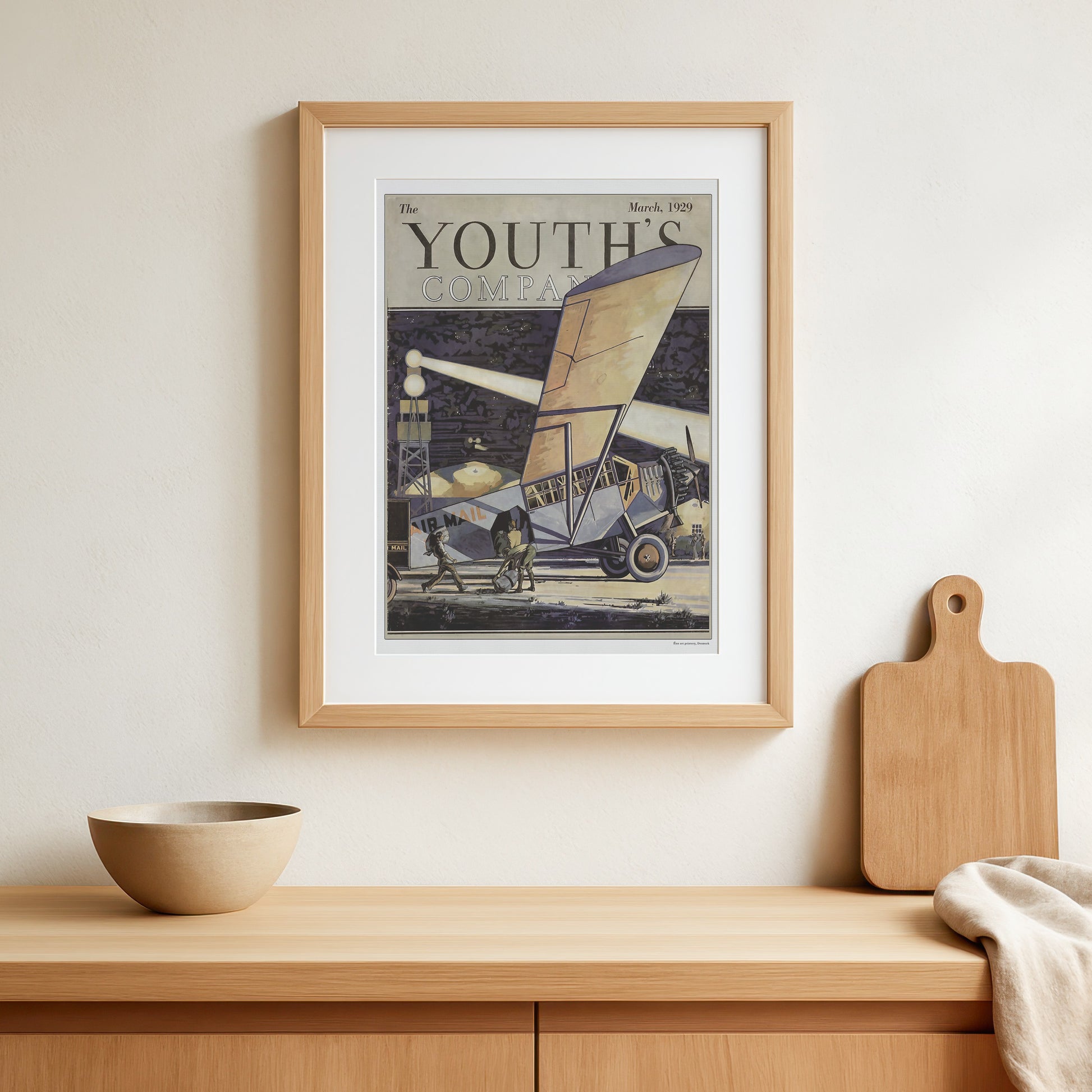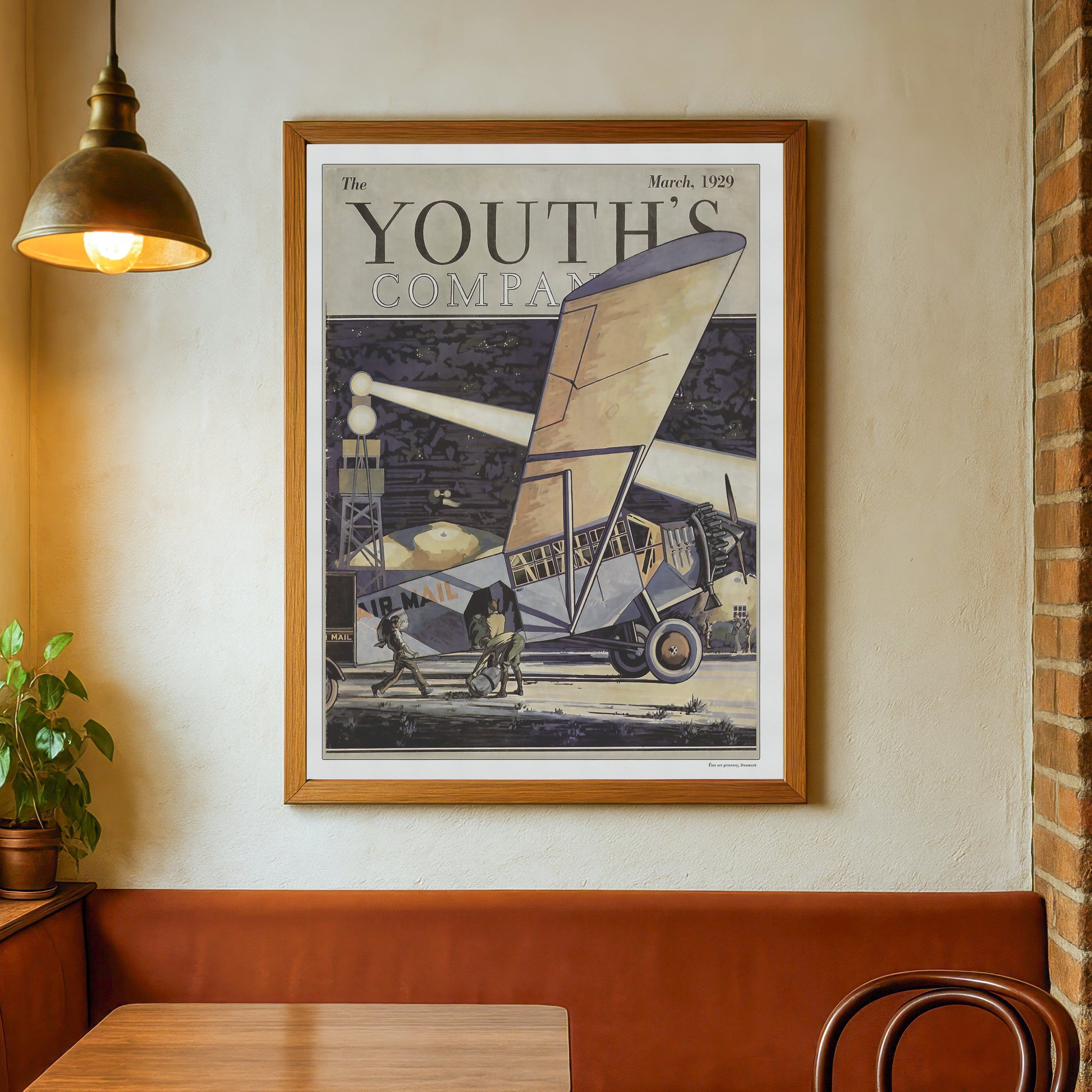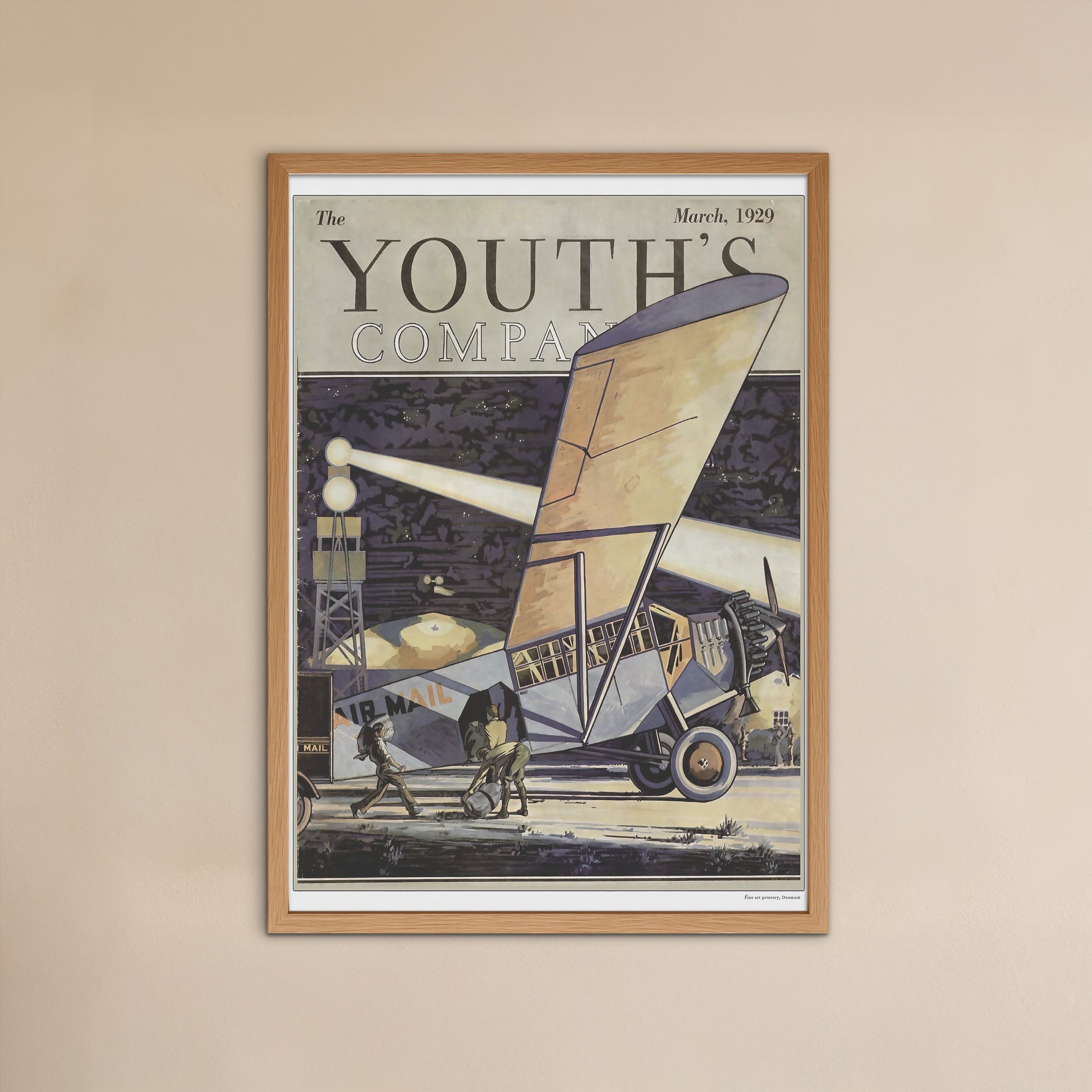 Træd tilbage i tiden med denne plakat, affotograferet og opskaleret af en elegant forside fra det ikoniske hendegangne Amerikanske ungdomsblad Youth's Companion, marts 1929. Den fængslende illustration skildrer en scene med et postfly omgivet af en gruppe hårdtarbejdende personer. The Youth's Companion Magazine, en elsket amerikansk ugentlig publikation, der havde sin tid fra 1827 til 1929, og henvendte sig til et ungt publikum og tilbød moralsk og pædagogisk indhold.