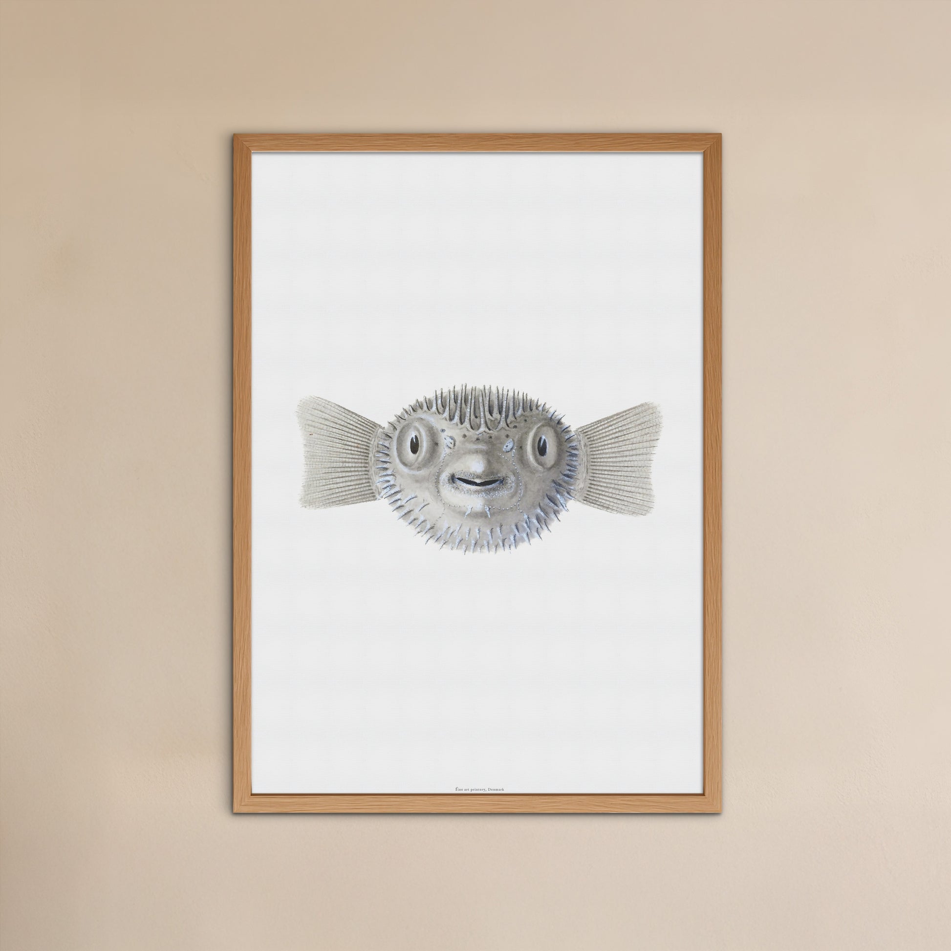 Motivet viser kuglefisken i sin oppustede tilstand, klar til forsvar, med alle dens pigge stikkende ud. Den centrale placering og det usædvanlige, men charmerende udtryk gør dette kunsttryk til et sandt samtaleemne. Illustrationens vintage stil og den monokrome palet med diskrete blå og grå nuancer giver plakaten et sofistikeret, men legende udtryk.